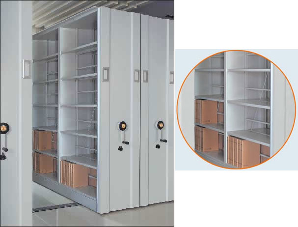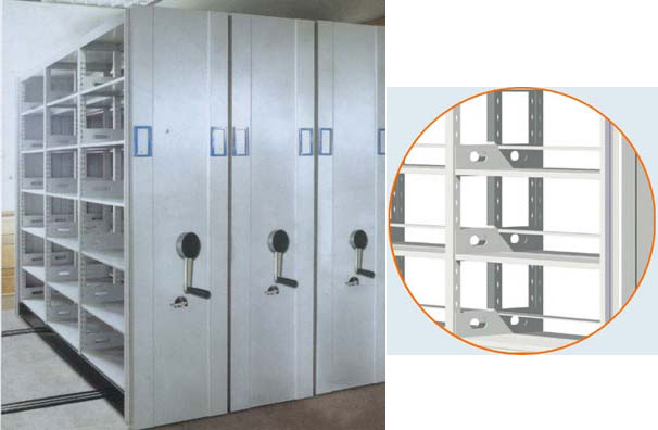 該樣式密集架經(jīng)濟(jì)實(shí)用,為多數(shù)檔案庫(kù)房、圖書(shū)檔案室所采用,被稱(chēng)為“普通型”或“標(biāo)準(zhǔn)型”手動(dòng)密集架。