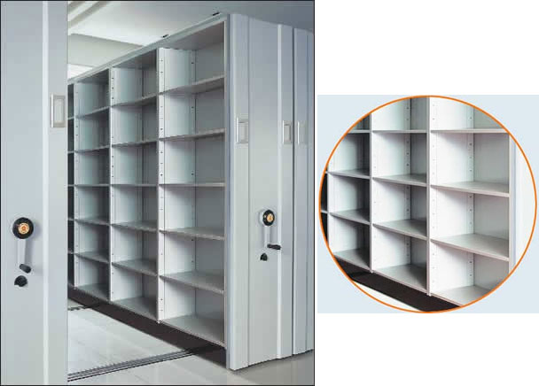 密集柜主要由軌道、底座、立柱(板式)、擱板、掛板、側(cè)靠板、背靠板、頂板、防塵板、護(hù)板、門(mén)板、傳動(dòng)機(jī)構(gòu)、防傾倒、防震、防塵、防鼠、制動(dòng)、緩沖、目錄卡及傳動(dòng)裝置、密封裝置組 成:
