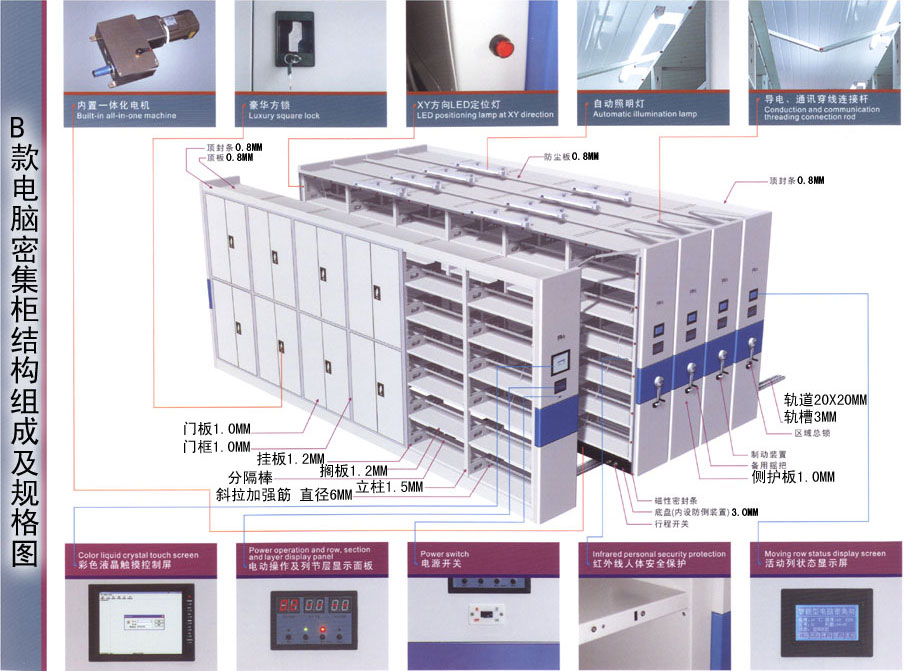 智能密集架的規格技術參數:標準高度2300mm,標準節距900mm,標準寬度500mm,標準層數為6層,層距330㎜,每層擱板均勻承重80㎏、主要由20mm×20mm方鋼軌道、3.0mm底盤、1.5mm復柱立桿、1.0mm擱板、1.2mm側面板、1.0mm門板、旋動機構、防震裝置、防倒裝置、制動裝置以及防塵、防鼠裝置、智能控制系統等部分組成。